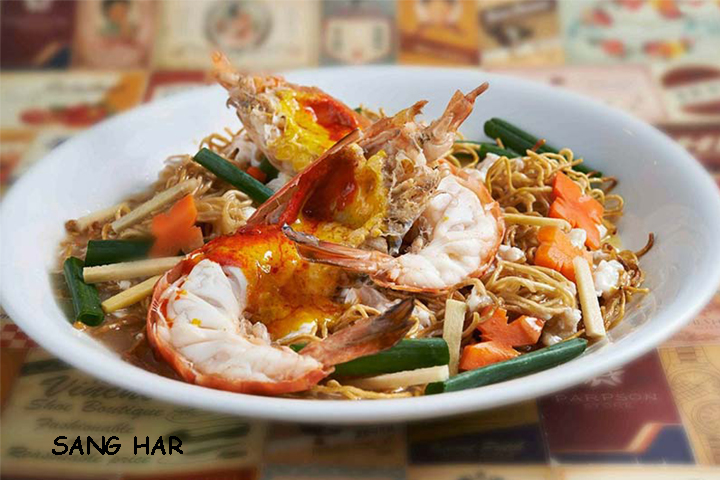 نودل سانگ هار (Sang Har) ترکیبی از میگوهای تازه رودخانهای است که به روش «آشپزی کانتونى» (Cantonese cuisine) در آبگوشت غلیظ تخم مرغ پخته میشود. ترکیب میگو با سس مایع تخم مرغ باعث میشود که این غذا طعمی واقعا شگفت انگیز را به خود بگیرد