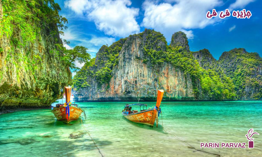 جزیره فی فی (Phi Phi) به خاطر زیبایی فرا زمینیاش مشهور است. کوه فی فی به مانند زیبارویی است که سرها با دیدنش برمیگردند و چشم از دیدنش سیر نمیشود و دوستدارانش تمامی ندارند. خوشبختانه در این جزیره شما انتخابهای زیادی دارید؛ سواحل سفید، آبهای لاجوردی و جنگلهای استوایی سه ویژگی جذاب در کنار هم هستند. در سمت جنوبی جوانترها آزادانه به تفریحات مورد علاقه خود مشغول هستند. با یک گشت دریایی با قایق دم بلند میتوانید میمونهای در حال تاب خوردن را تماشا کنید، نقاشیهای ما قبل تاریخی در غارها را ببینید و با ارائه مدرک غواصی حرفهای (PADI) از صخرههای آن بهره ببرید.