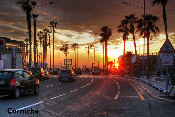 کورنیش کازابلانکا منطقه روبروی ساحل مناسب کسانی است که دوست دارند ببینید و دیده شوند.بیشتر مناطق این ساحل به رستوران ها و هتل های بسیار شیک اختصاص دارد. در طول روز نیز ساحل آفتابی کورنیش مناسب قدم زدن و لذت بردن از آفتاب است. در امتداد کورنیش نیز ساحل عمومی قرار دارد.