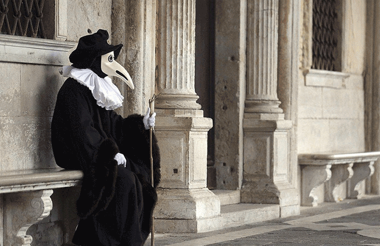 3- مدیکو دلا پسته : یا پزشک طاعون با منقار بلندش یکی از متمایزترین ماسک های کارناوال ونیز به شمار »ی آید که در قرن هفدهم یک پزشک فرانسوی برای پیشگیری از ابتلا به طاعون طراحی کرده بود. این ماسک اغلب به رنگ سفید با منقار توخالی و چشم هایی گرد که صفحاتی شفاف روی آنها قرار گرفته و شبیه به عینک به نظر میرسد دیده میشود.