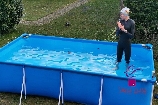در آن استخر پلاستیکی گذاشته و با بستن خودش با طناب کیلومترها شنا می کند و از تمرینات خود در قرنطینه عقب نمی ماند.